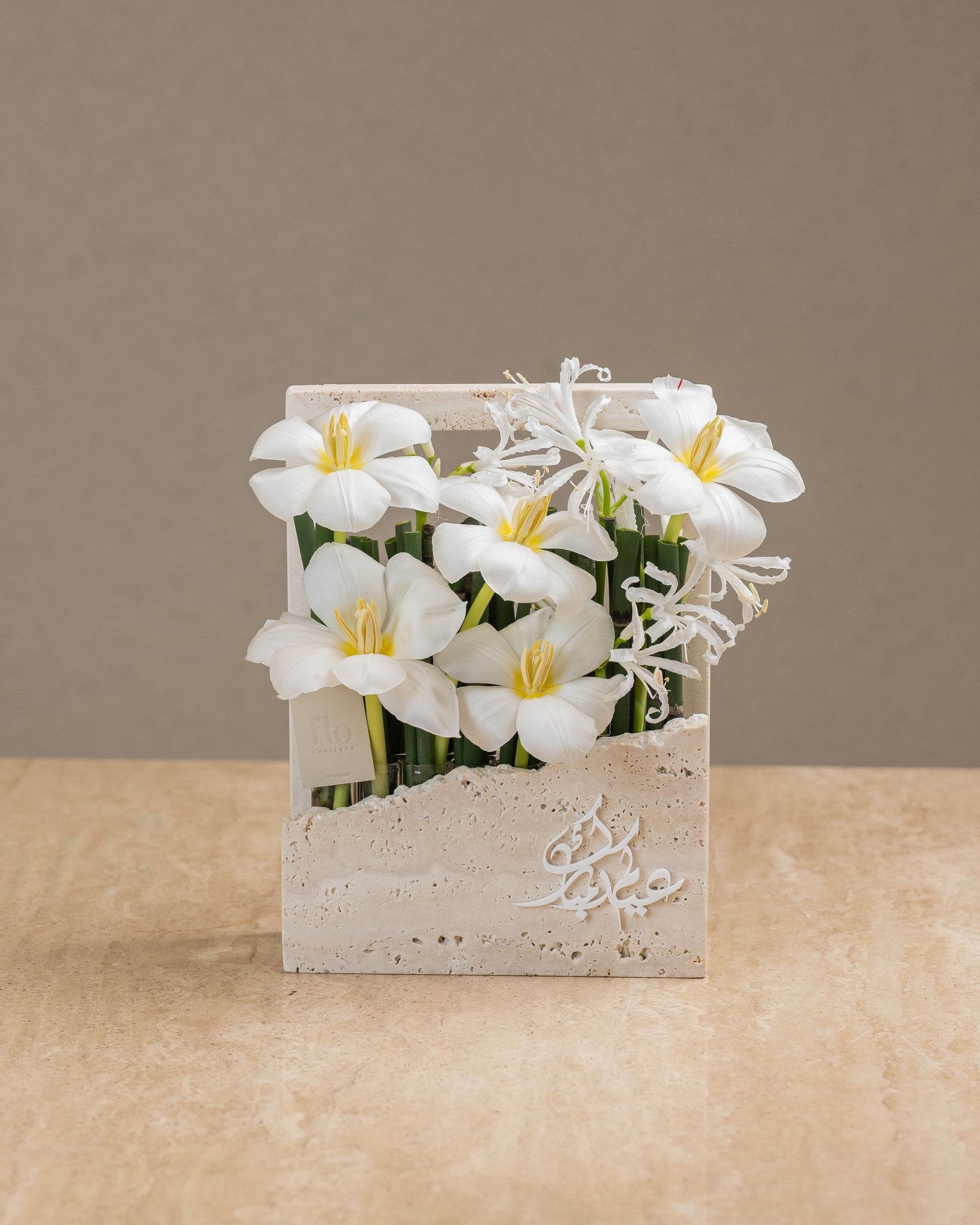 لإكمال هذه المجموعة الرائعة ، قمنا برعاية تنسيق زهور غريب يرفع الجماليات إلى آفاق جديدة. أزهار منتقاة يدويًا من جميع أنحاء العالم ، مرتبة بعناية لخلق مزيج متناغم من الألوان والقوام والروائح ، مما يوفر نقطة محورية تخطف الأنفاس. يضيف ترتيب الأزهار لمسة من روعة الطبيعة إلى الأناقة الراقية لصينية وموقد رخام الترافرتين ، مما يخلق قطعة مركزية ساحرة تأسر الحواس.