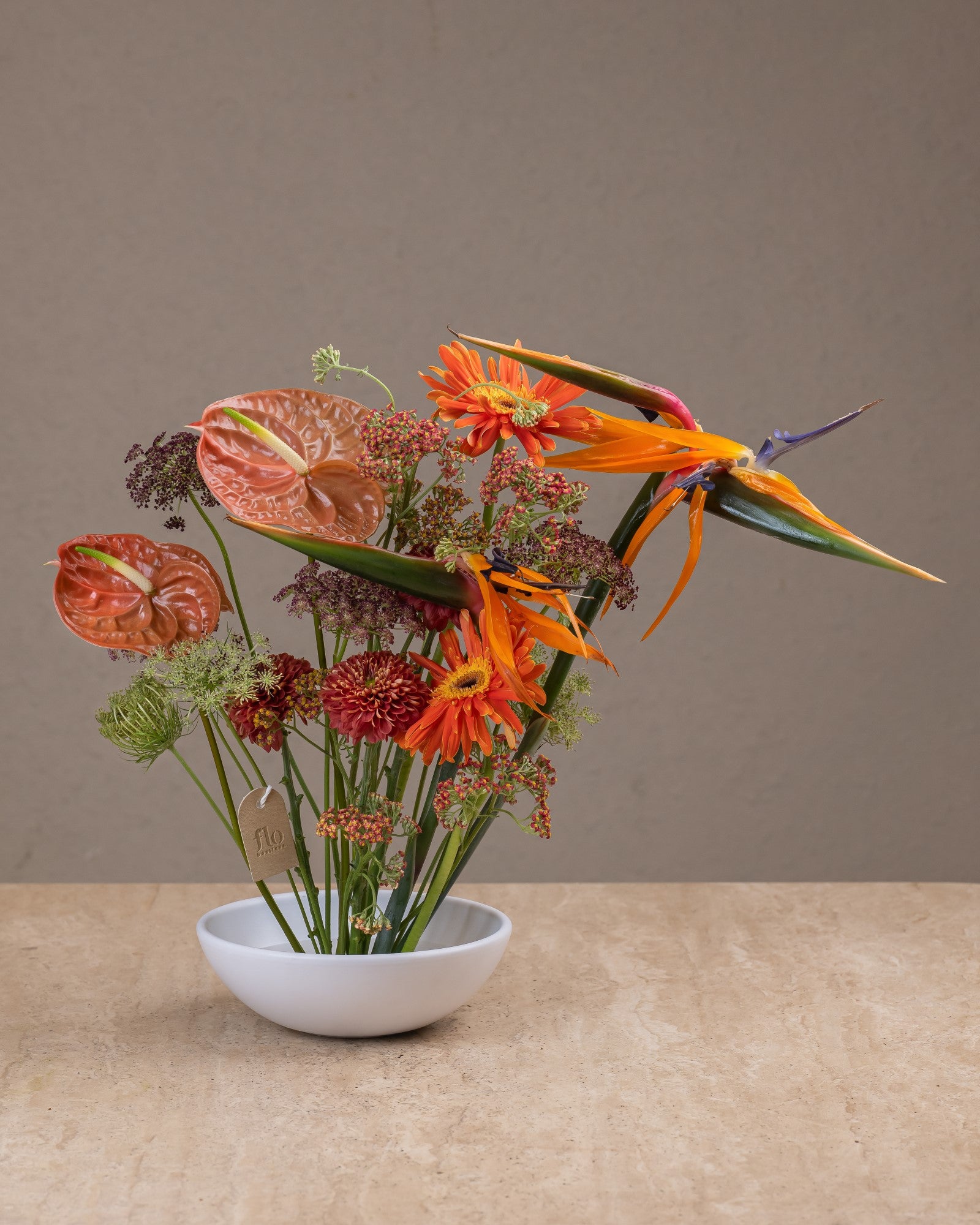 Get ready to add a burst of color and tropical vibes with Aliyah! This stunning flower arrangement features a beautiful blend of bright orange anthurium and exotic bird of paradise. Bring a touch of paradise into any room with Aliyah. (Note: No birds were harmed in the making of this arrangement!)