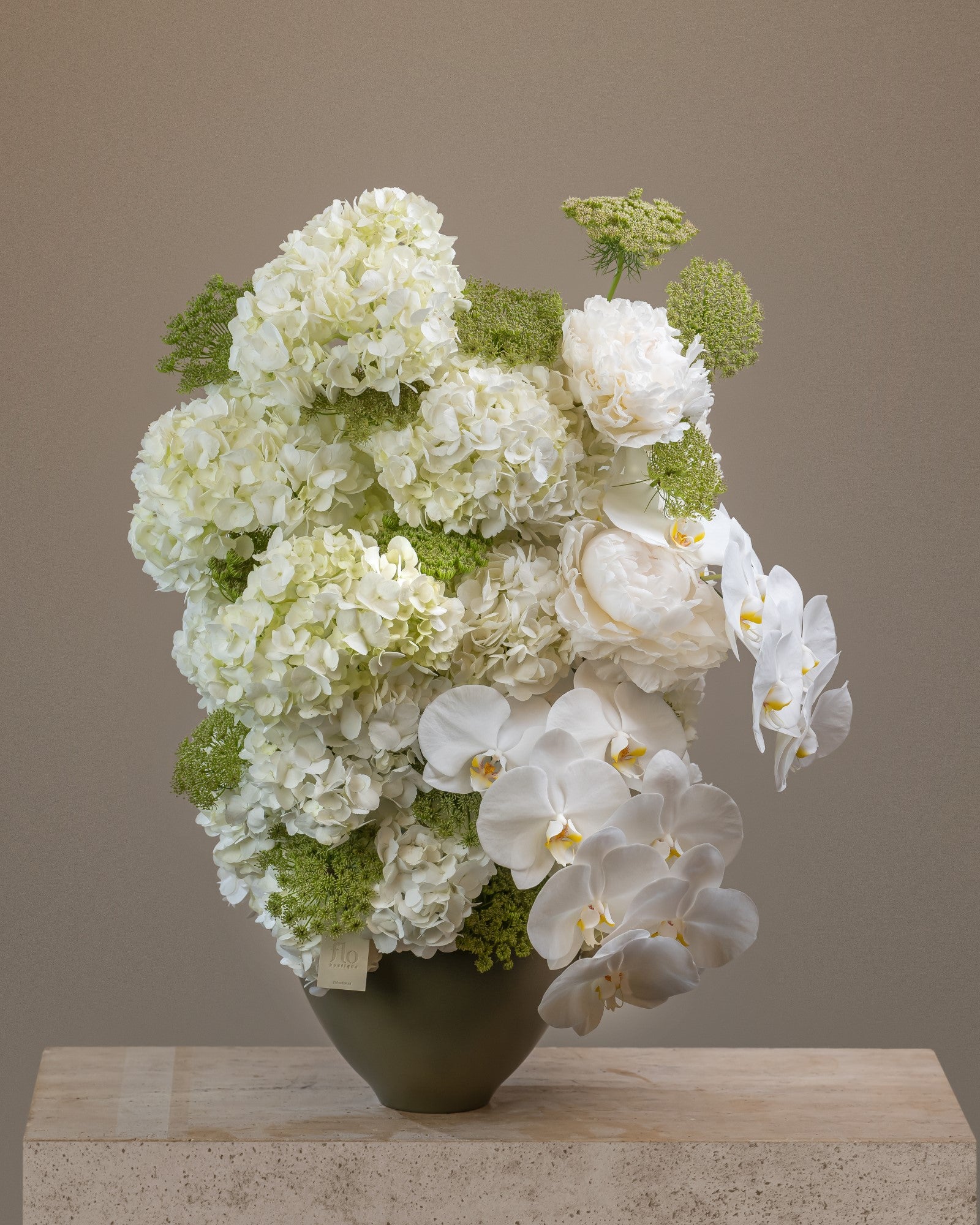 "Bring some life to your space with Amayah, a stunning flower arrangement featuring a white orchid and hydrangea. This beautiful addition will uplift any room and add a touch of elegance. No green thumb needed!"