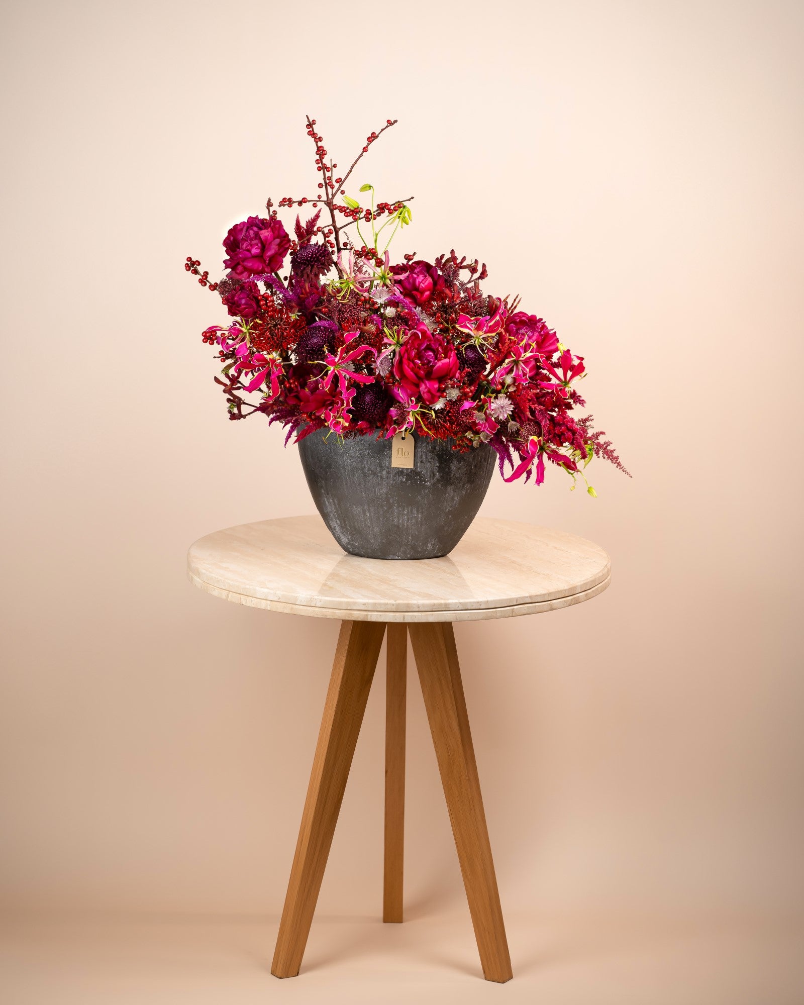 Angelique is a stunning maroon flower arrangement, perfect for adding a touch of elegance to any space. With its rich color palette and expertly arranged blooms, it is sure to impress any viewer. Bring the beauty of nature into your home or office with Angelique.