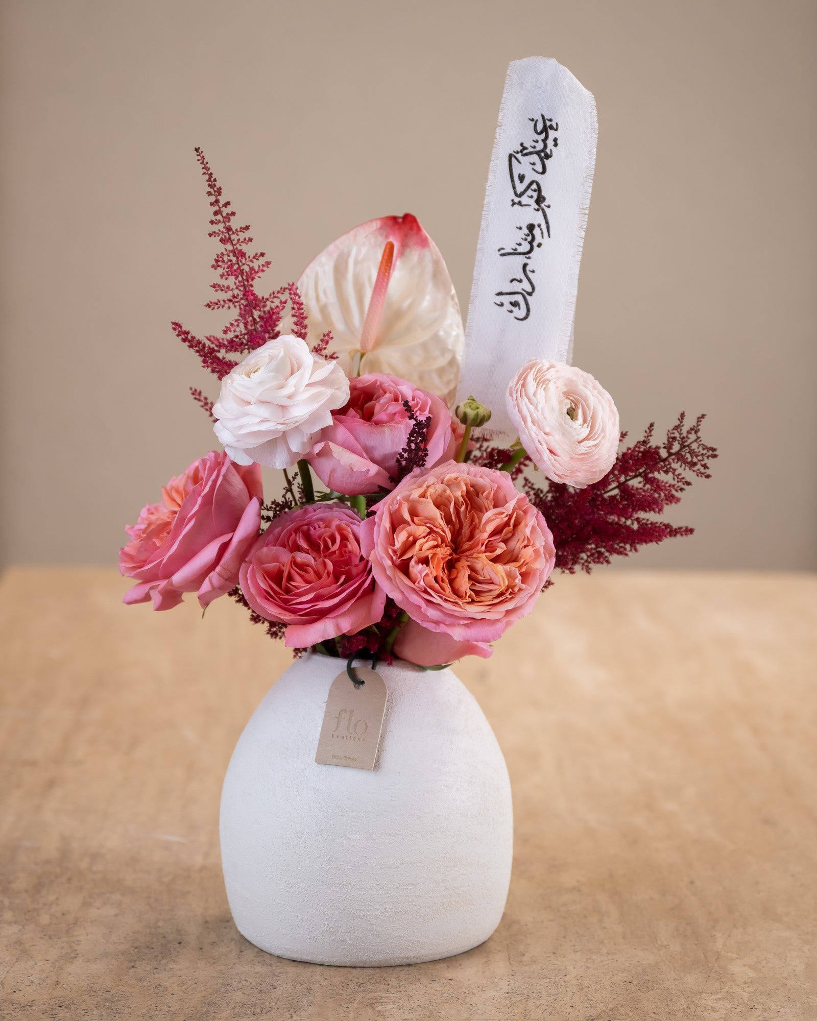 Aurelia is a luxurious white vase, elegantly adorned with a stunning natural flower arrangement. Perfect for the Eid celebration, this vase adds a touch of sophistication to any space. Enjoy the beauty of flowers without the maintenance, and elevate your decor with Aurelia.