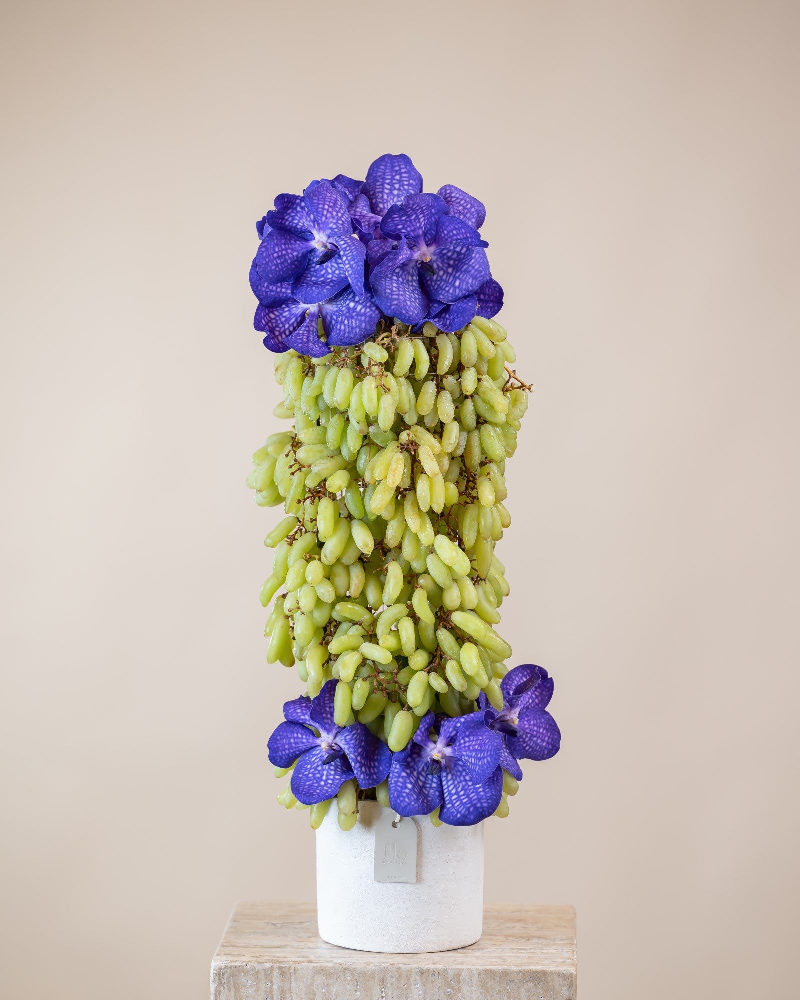 Introducing Cielo, a one-of-a-kind flower arrangement featuring fresh grapes and unique flowers. Elevate any space with the elegant combination of floral and fruit, adding a touch of luxury to your home or special event.