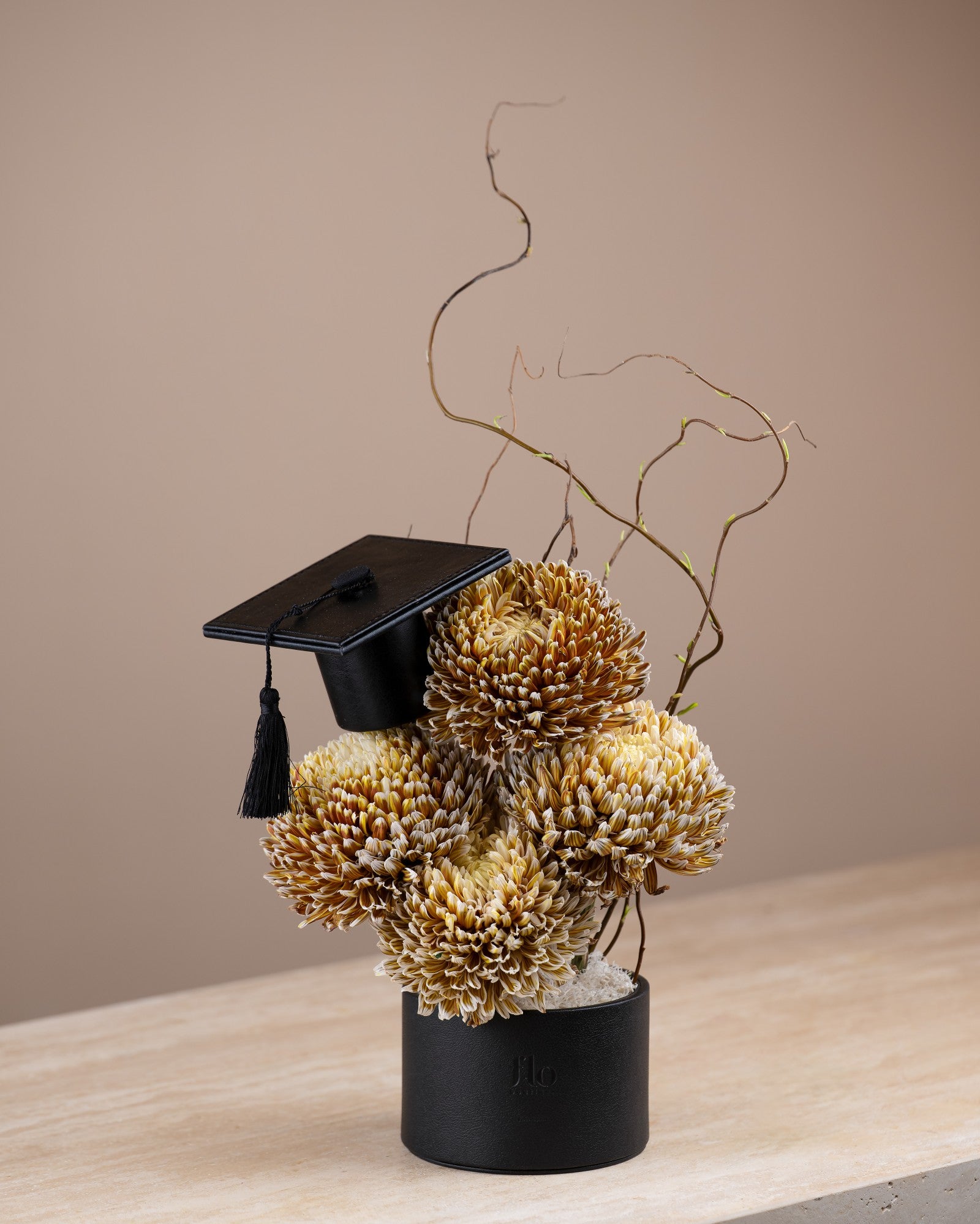 Cleo is a small graduation flower arrangement that adds a touch of elegance to any celebration. Expertly designed with precision and care, this arrangement features a beautiful selection of vibrant flowers, perfect for congratulating your loved one on their accomplishment.