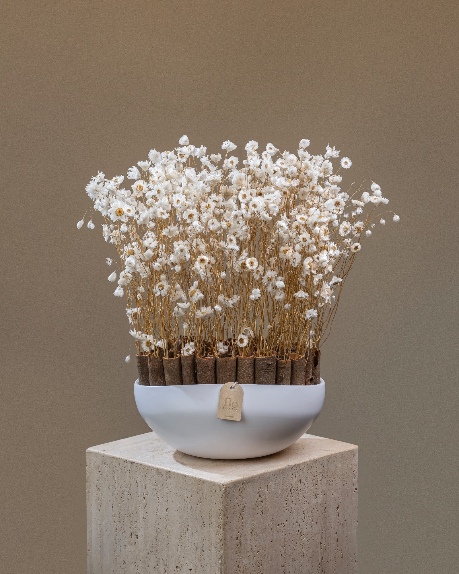 Let Dry Mist luxuriously adorn your home with its modern dry flower arrangement. Expertly crafted using only the finest blooms, it is sure to add a touch of refined elegance to your decor. Enjoy the unique beauty of Dry Mist's intricate floral designs, and be enchanted by its delicate aroma.