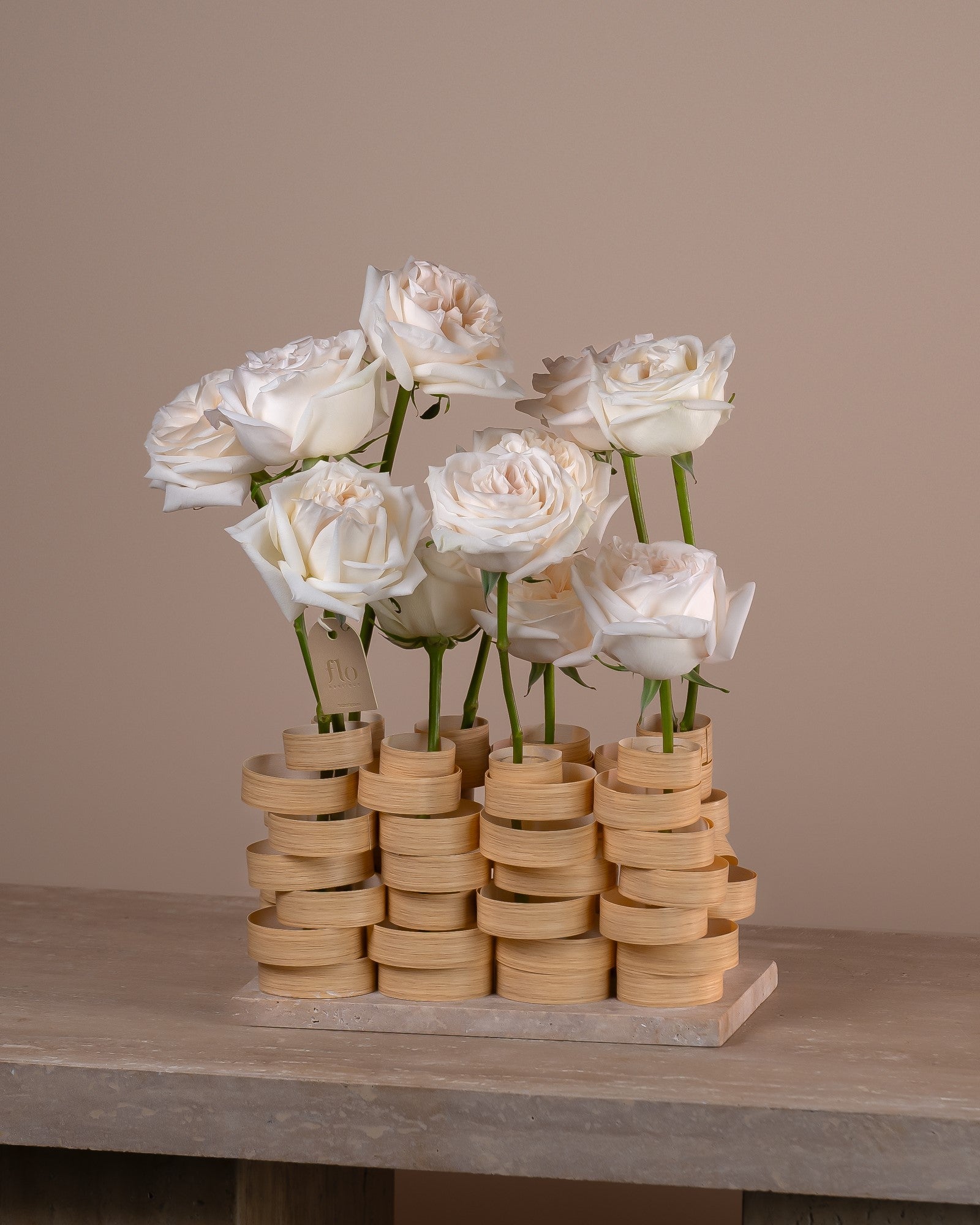 The Elia flower arrangement boasts a stunning and precise design that is sure to elevate any space. Expertly crafted with precision and care, this arrangement brings nature's beauty indoors and can impart a sense of tranquility and elegance. Perfect for any room or occasion.