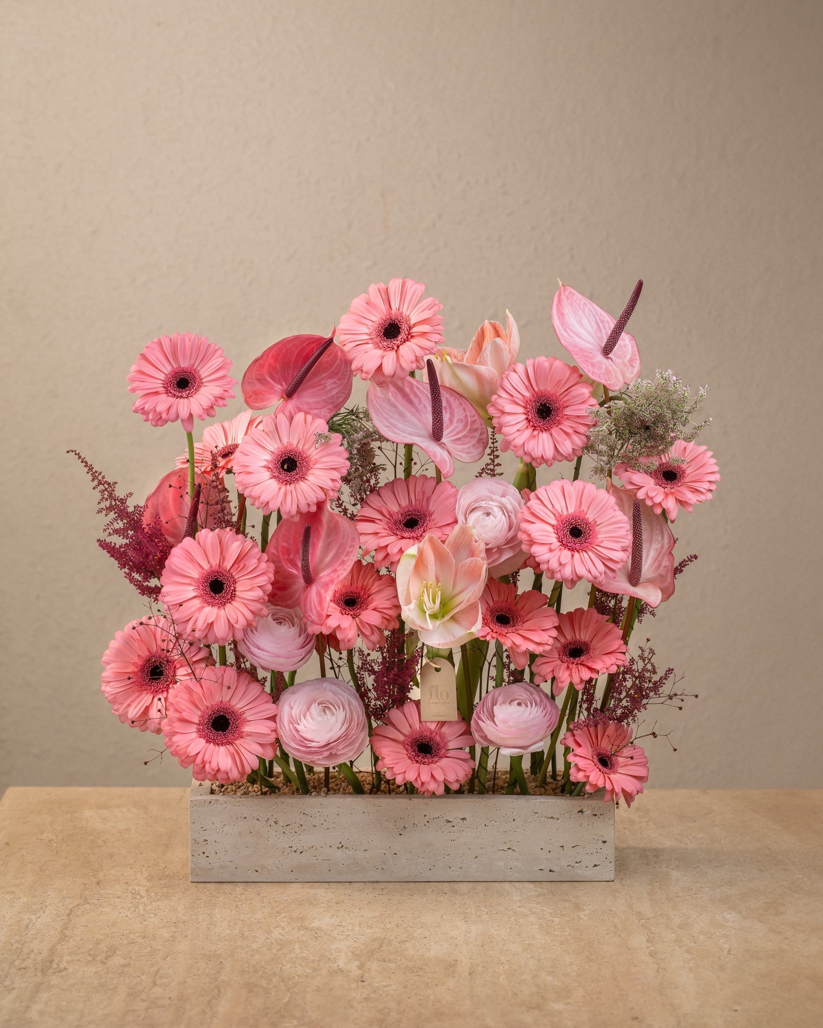 Experience the beauty of nature with Juliana - a stunning flower arrangement featuring a bold blend of pink hues to add a touch of uniqueness to any space. Bring a burst of color and delight to your home or office with this one-of-a-kind natural creation.