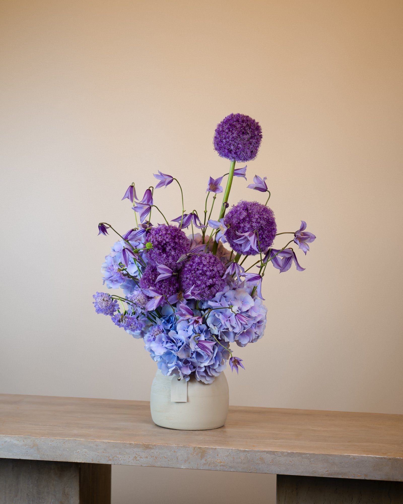 Expertly crafted and designed, Laylani boasts a standout feature: a stunning arrangement of unique purple flowers. Add a touch of elegance and sophistication to any space with this distinctive centerpiece.