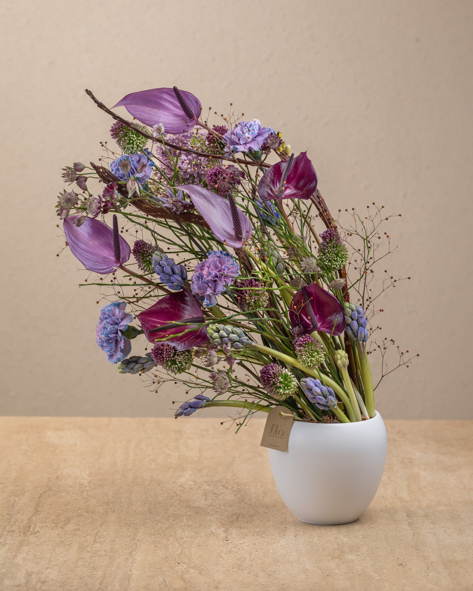 Maggie: the perfect pop of color for any space! This flower arrangement features vibrant, purple blooms that will brighten up any room. Add a touch of whimsy to your home or office with Maggie's unique design. (Limited stock, so grab Maggie before she's gone!)