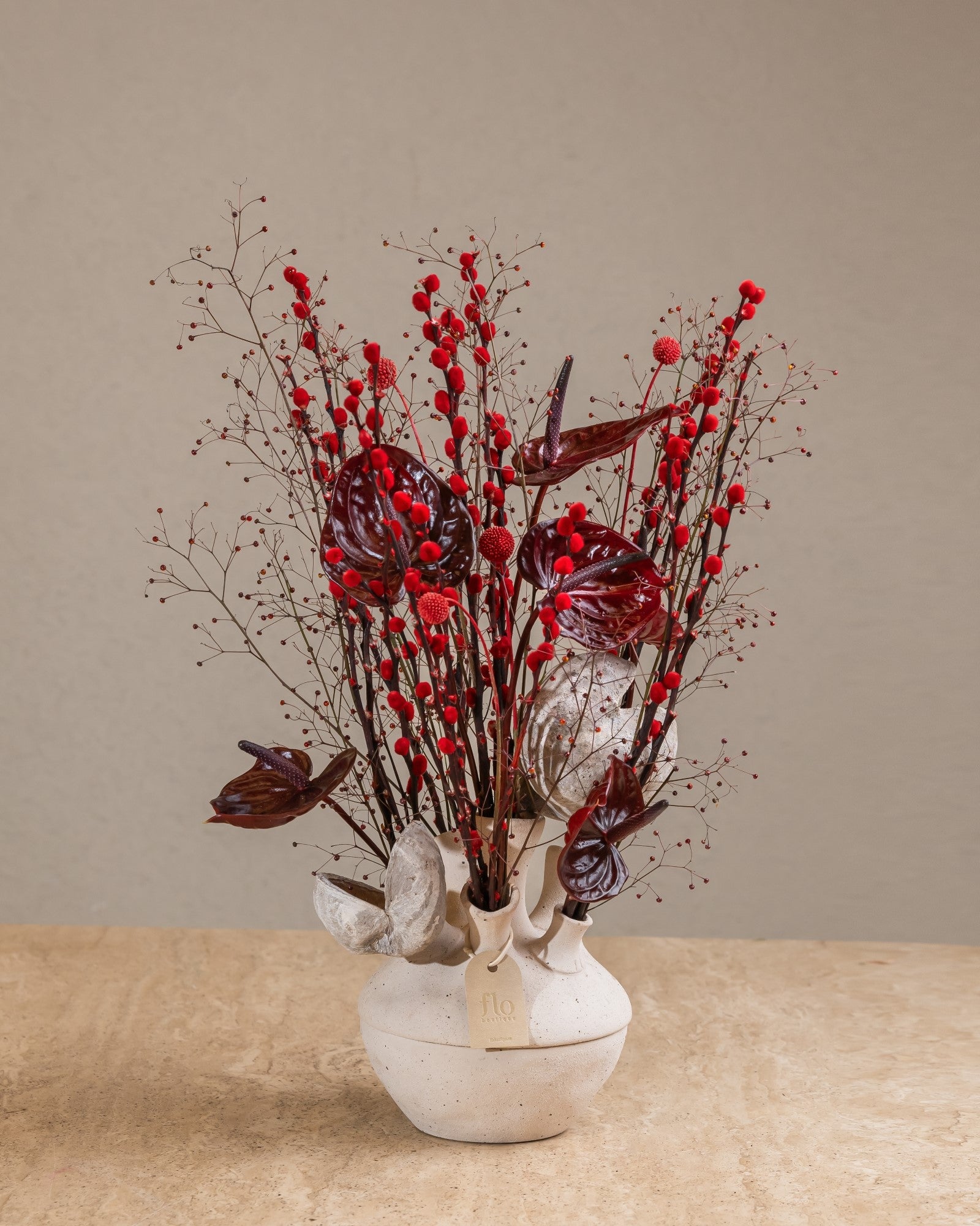 "Add a pop of color to your space with Mila, featuring a maroon anthurium and vibrant red cotton silex arrangement. Bring joy to any room with this quirky and playful addition."