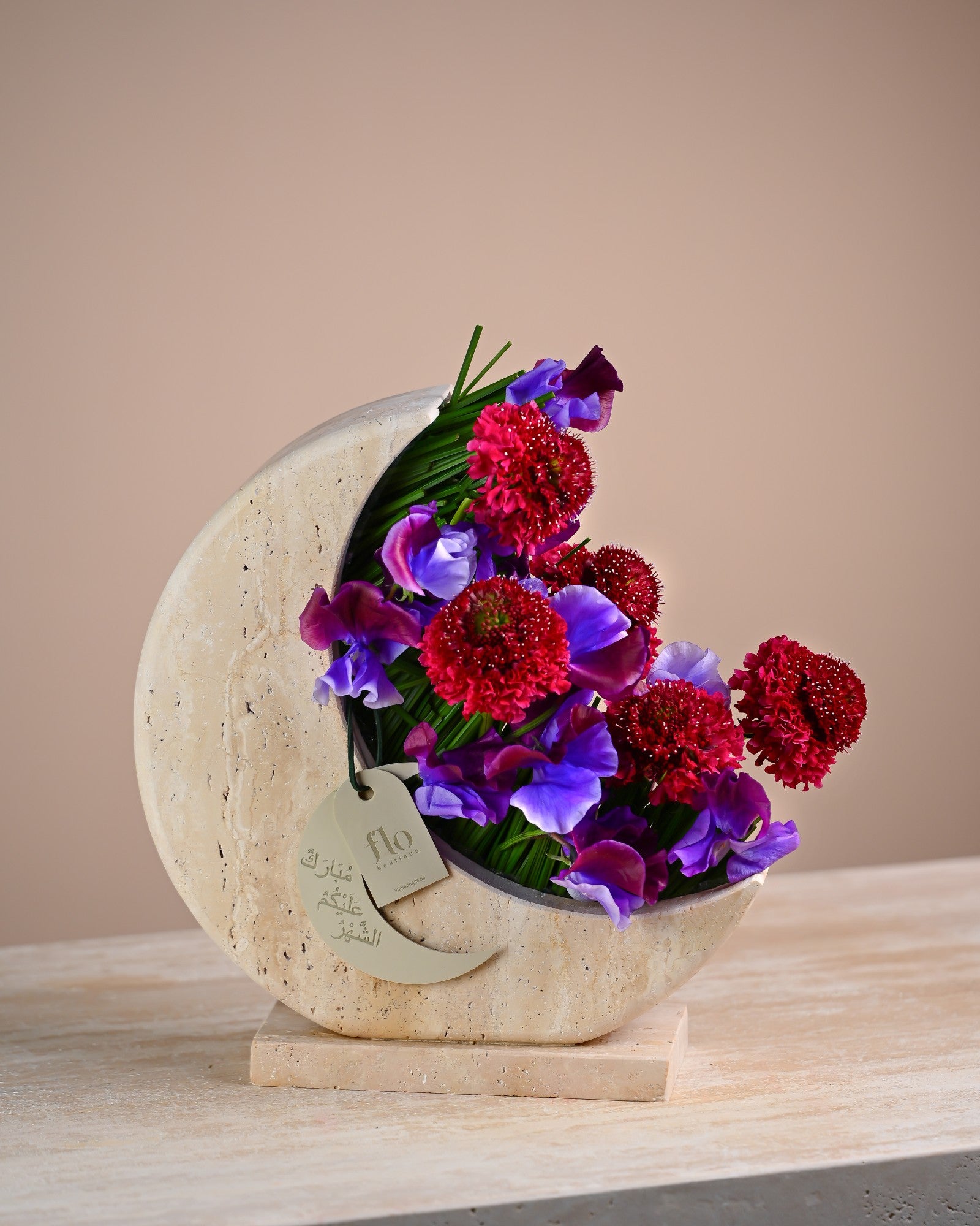 Enhance your Ramadan celebrations with the moon flower arrangement. Hand-crafted by our experts, this stunning centerpiece features delicate blooms arranged in the shape of a crescent moon. Elevate your home decor and bring a touch of elegance to your festivities with this unique and meaningful piece.