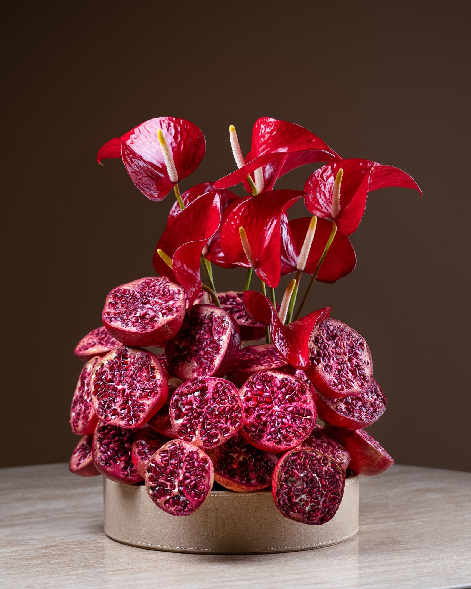 Nancy is a sophisticated floral arrangement that combines vibrant red blooms with the natural texture and rich color of pomegranate accents. This expertly curated composition brings together the elegance of fresh flowers with organic botanical elements, creating a striking centerpiece that captures attention in any space. The interplay between delicate petals and pomegranate's distinctive form offers visual depth and a modern aesthetic. Perfect for special occasions or as a refined gift, Nancy delivers both beauty and botanical interest that transcends typical floral presentations.
