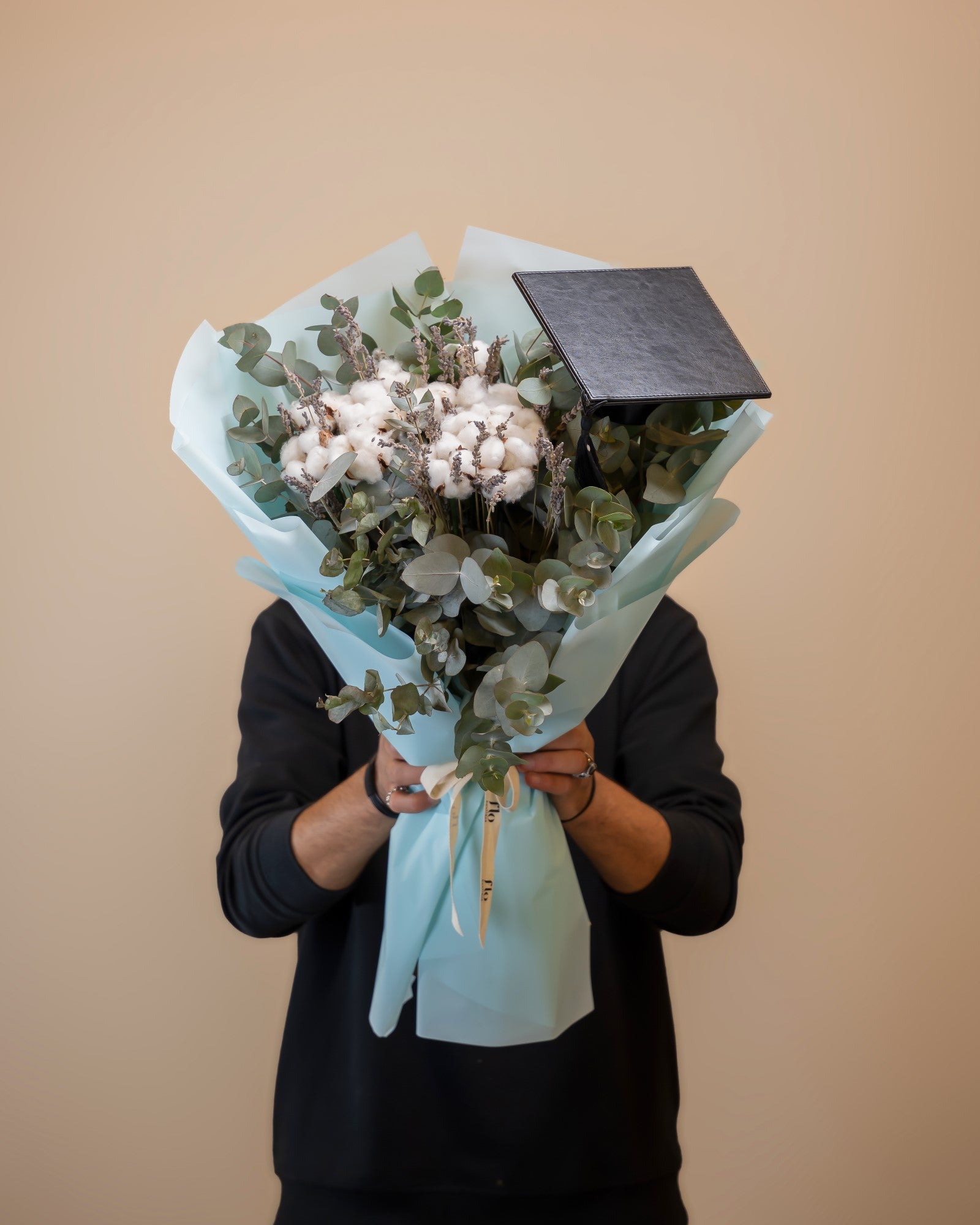 Celebrate your graduation with Nia, a stunning natural flower bouquet featuring the delicate beauty of cotton flowers and the refreshing scent of eucalyptus. Made with care and expertise, this bouquet is a perfect gift to congratulate and honor the achievement of your loved one.