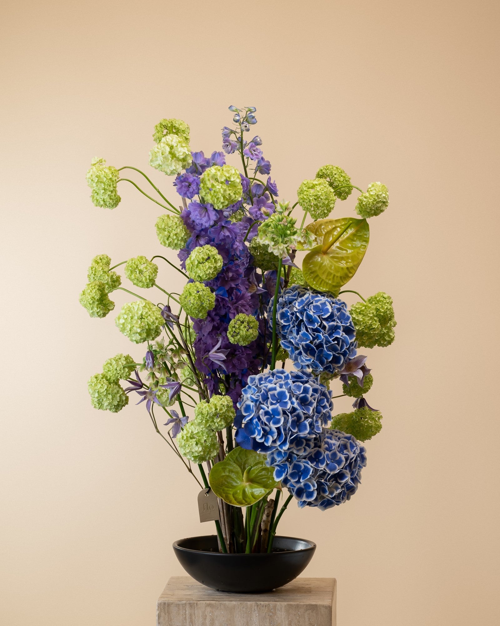 Tru is a unique floral arrangement featuring stunning blue hues and striking green blooms. The natural arrangement adds a touch of elegance to any space, making it a beautiful addition to your home or office. With its eye-catching colors and distinctive design, Tru is the perfect way to infuse nature into your surroundings.