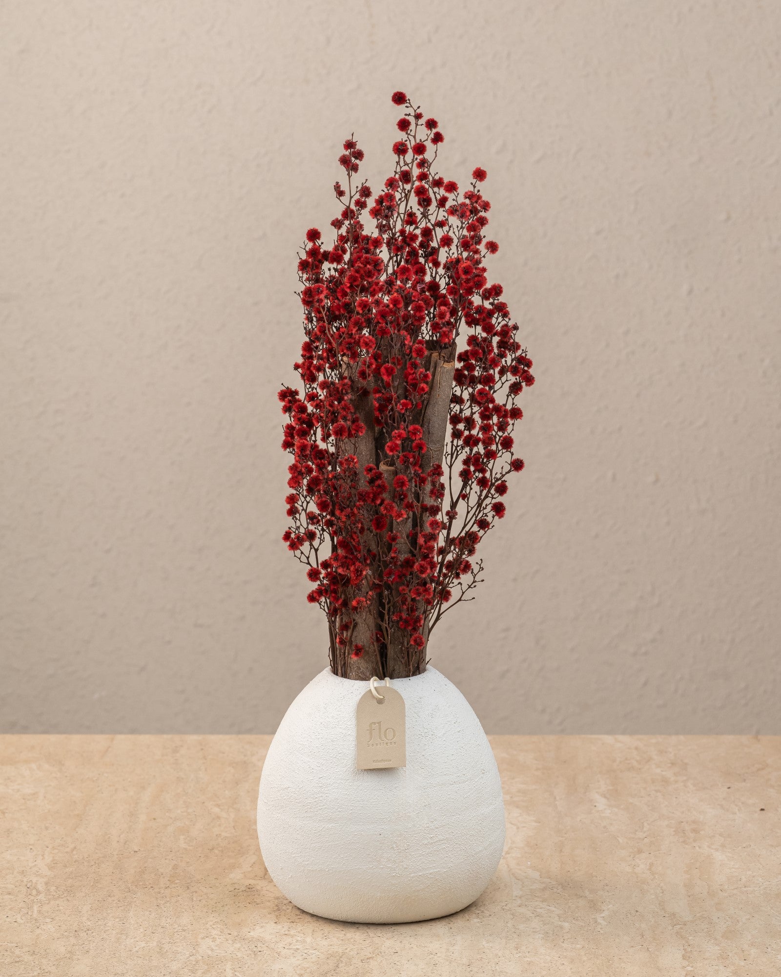 "Add a pop of color and spice up your decor with Valentina! This dry flower arrangement features a deep red hue and a touch of cinnamon, giving your space an elegant and cozy vibe. Perfect for any room in need of a unique and playful touch."