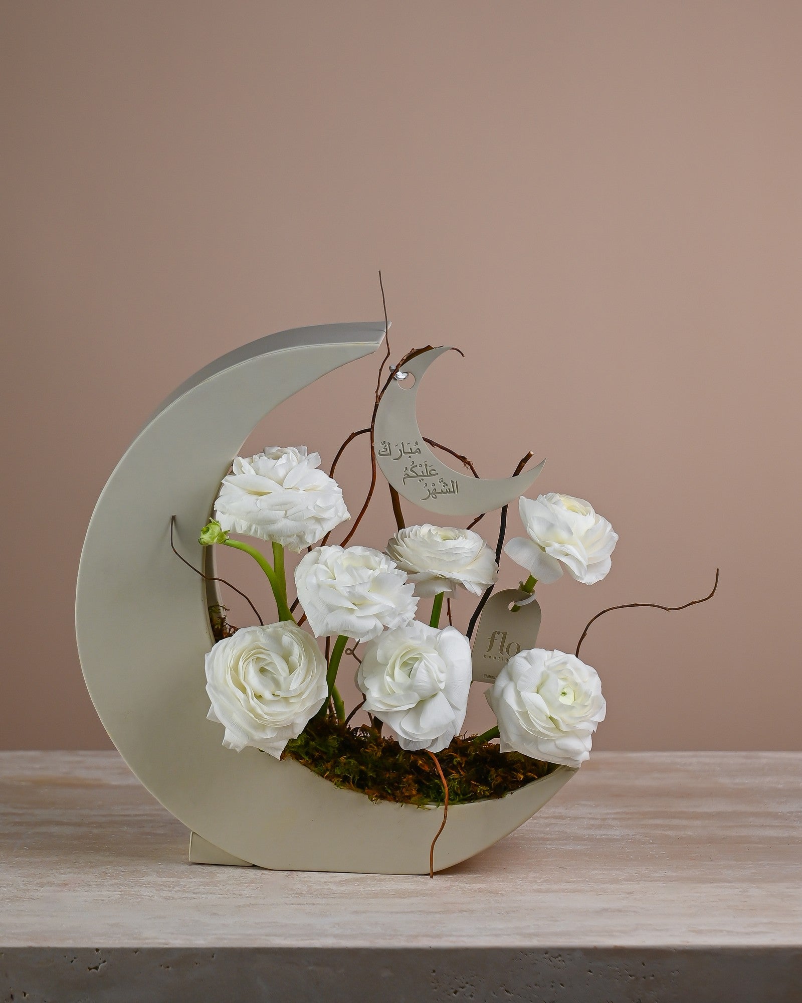 Enhance your Ramadan celebrations with the elegant whitee flower arrangement. Featuring delicate blooms and vibrant greenery, this arrangement is sure to add beauty and charm to any space. Perfect for creating a peaceful and festive atmosphere during this special time.