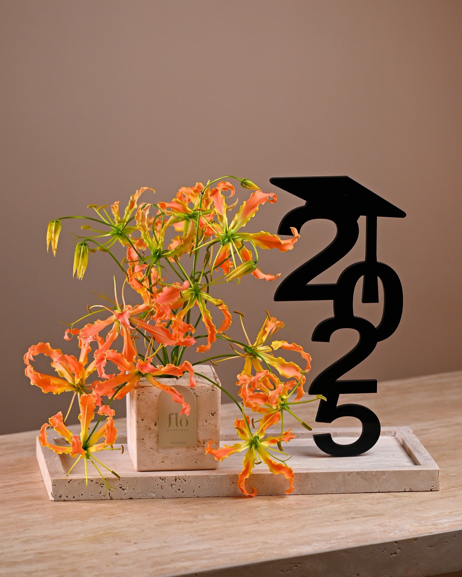 This elegant graduation flower arrangement, Zoya, offers a sophisticated touch to any celebration. Handcrafted with precision, it features a stunning array of blooms that symbolize growth and success. Perfect for a graduate in need of a special congratulatory gift.